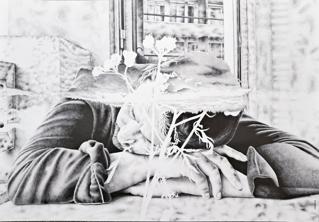 Nature morte, portrait, paysage ? C’est sans doute l’histoire qui réunit les genres : la silhouette d’un végétal instaure un temps passé sur cet homme immobile, la tête posée sur les mains. Qu’importe qu’il soit songeur ou mélancolique. C’est le paysage qui le traverse et qui apparait dans un second temps, c’est le reflet dans la vitre en arrière-plan qui posent la scène. Est-on dans sa tête ou le décor existe-il vraiment ? On est entre l’intérieur et l’extérieur, le concret et la pensée. On a les yeux sur un dessin détaillé qui joue avec les ombres et la lumière, on est aussi sur un dessin qui contrebalance le réalisme avec des trames de points plus aléatoires. Bref, chaque élément est à distance mais pourtant, des indices jouent avec notre perception pour les réunir. On est confus, comme ce personnage qui disparaît à moitié dans ses pensées.