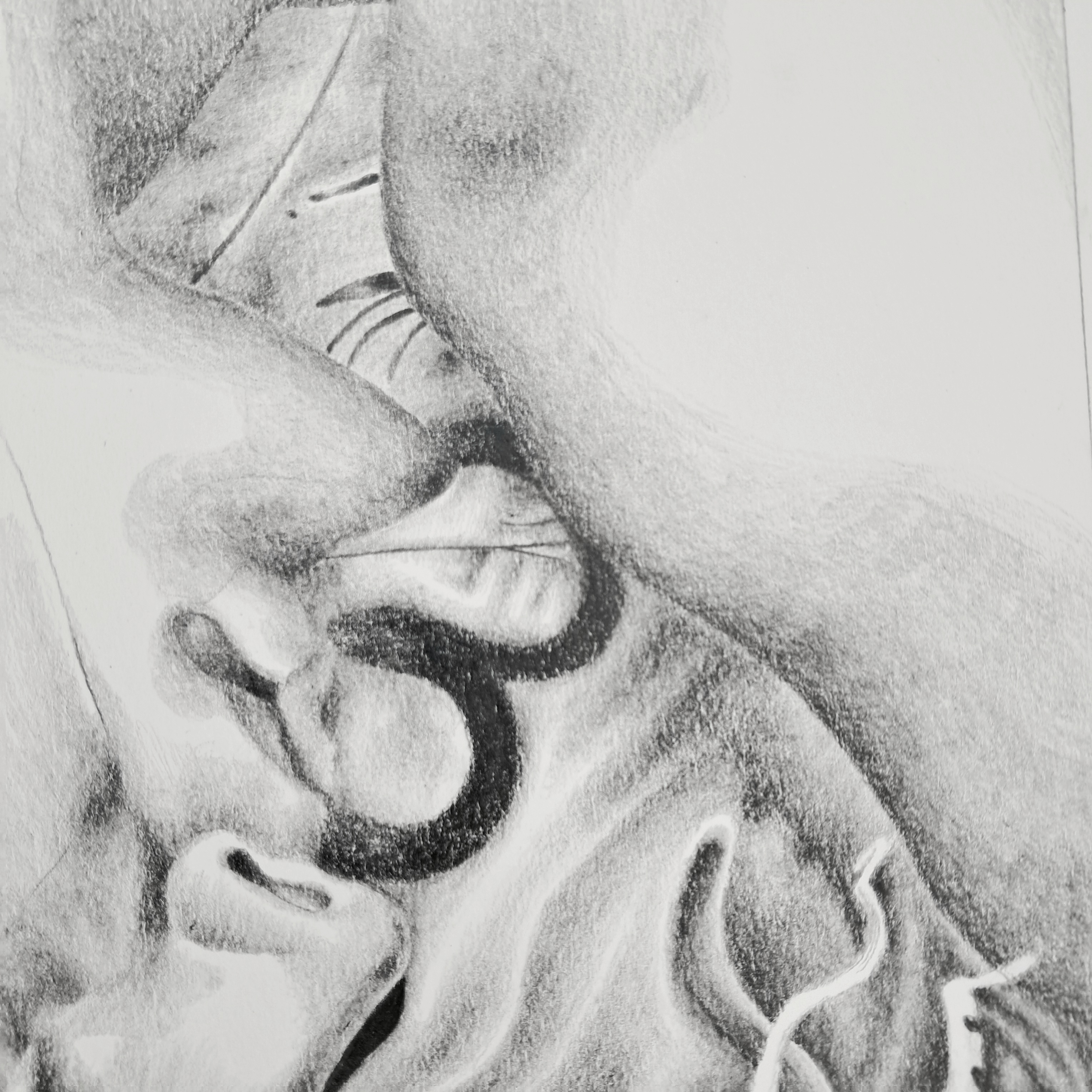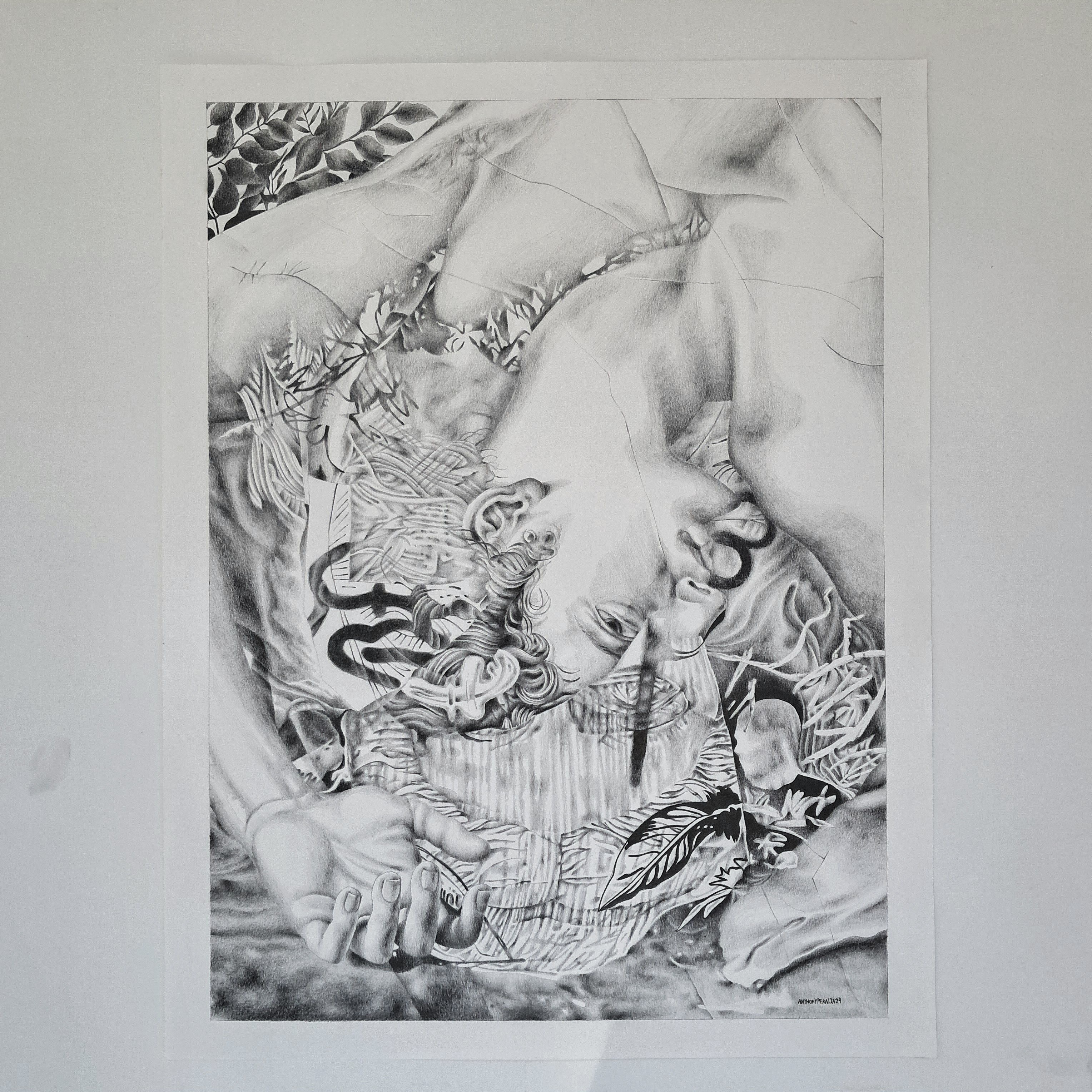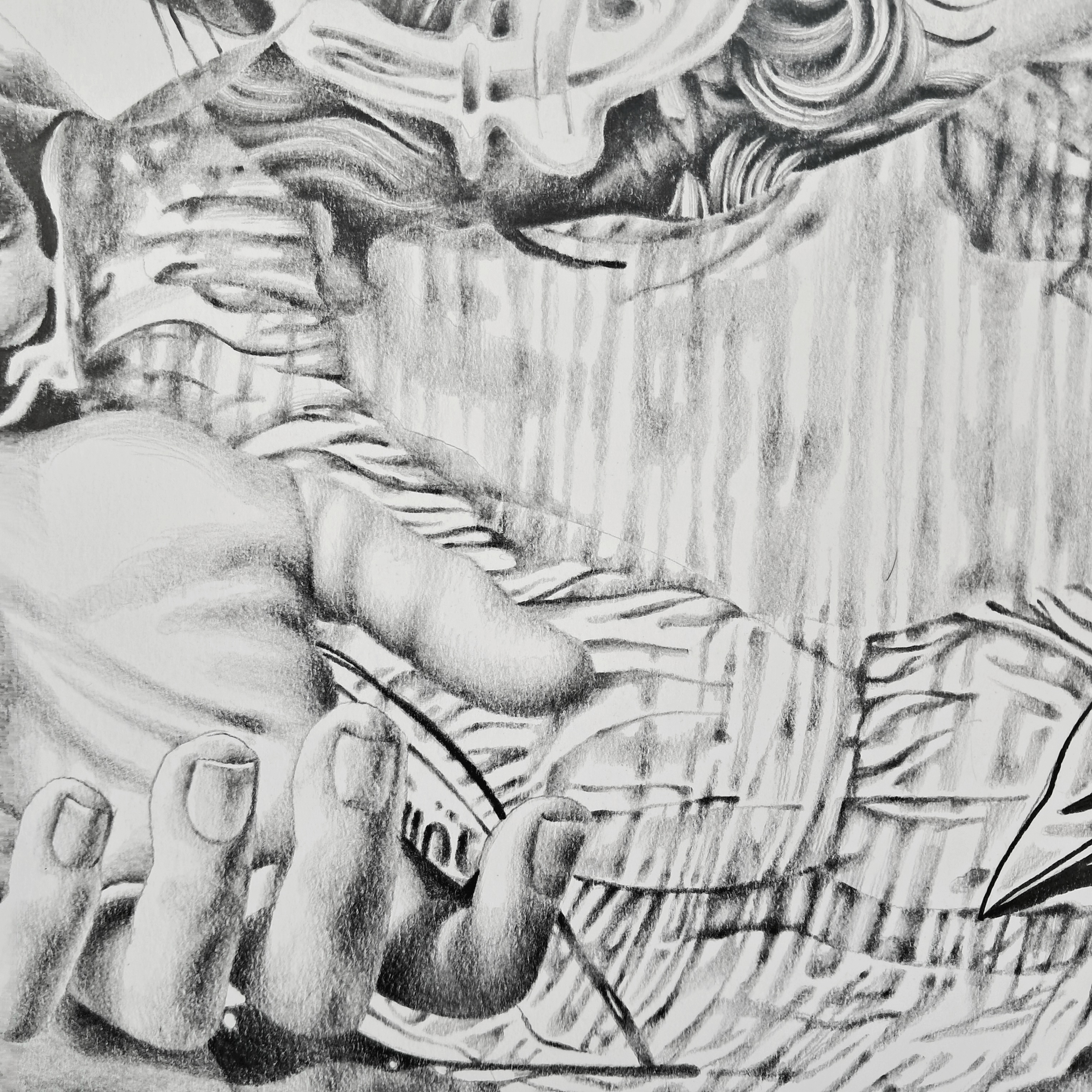 Avoir la pensée lourde, comme un bourdonnement qui s’amplifie. Va-t-il s’en aller si ce flux sonore intérieur est rendu visible ? Les jours qui ont suivi ce questionnement, j’ai découvert en plein milieu d’une salle d’exposition du Musée Fabre de Montpellier, un tableau représentant Abel, renversé sur le sol, la main délicatement posée près de sa chevelure. Il était si calme alors qu’une dispute avait éclatée quelques temps auparavant avec son frère. Cette image, empreinte de silence et de drame, est devenue pour moi un point de départ. Je suis allé la voir deux jours de suite. Je la trouvais si vide et détachée du contexte. Et puis, l’idée de ce bourdonnement intérieur me restait en tête. Grand admirateur du travail de l’artiste Frédéric Mallette, j’ai choisi de m’inspirer de certaines de ses explorations graphiques, lui empruntant quelques motifs. J’ai recadré la scène, le reste ne m’intéressait pas. Détachée de son récit d’origine, j’ai hybridé et dédoublé le personnage. Couronné d’une tête gréco-romaine, il semblait maintenant flotter entre plusieurs temporalités. Les maux du passé resurgissent. Le présent ne les comble pas encore. Bref, comme à mon habitude, les lignes viennent s’effacer et se superposer, tantôt en positif, tantôt en négatif. De la tête surgit enfin une forme organique : une explosion végétale, une excroissance incontrôlée, quelque chose de monstrueux dans tous les cas. Progressivement, l’image se saturait et devenait enfin bruyante. Devais-je laisser les craquelures du vernis ? J’ai hésité. Elles sont belles et fines. Je les ai laissées, elles pansent ce corps inerte dans ce bruit incessant. Bref, les lignes, les craquelures, le bourdonnement, tout est là. Mais il me faut maintenant un autre tableau pour continuer l’exploration du flux sonore. À suivre.