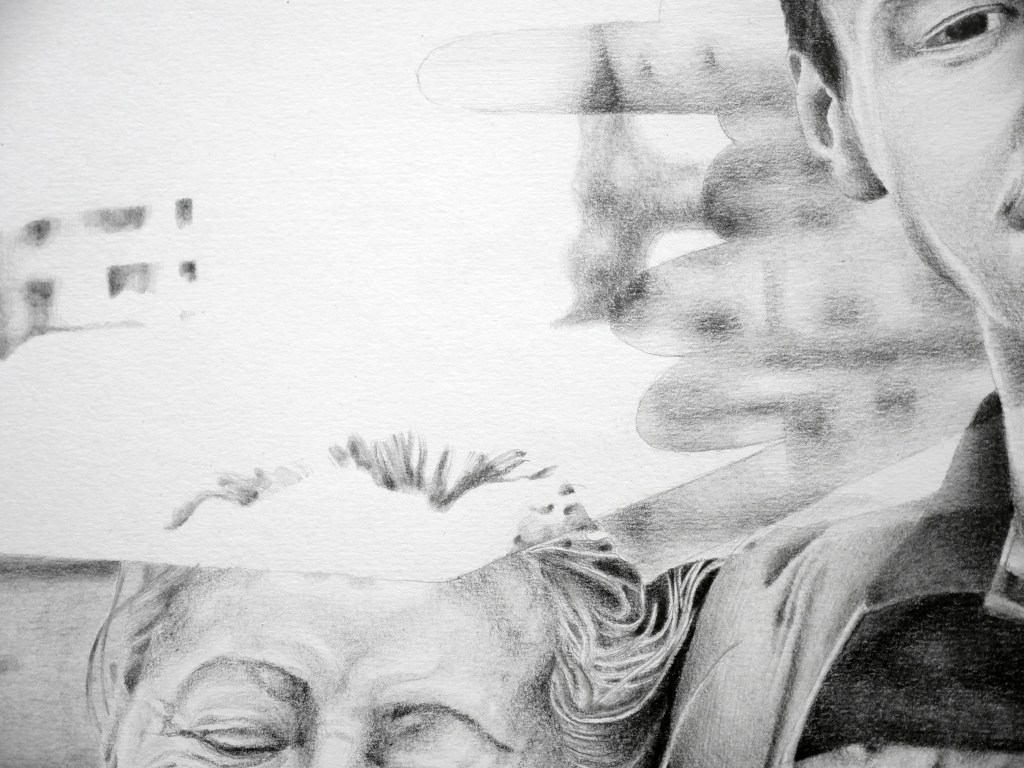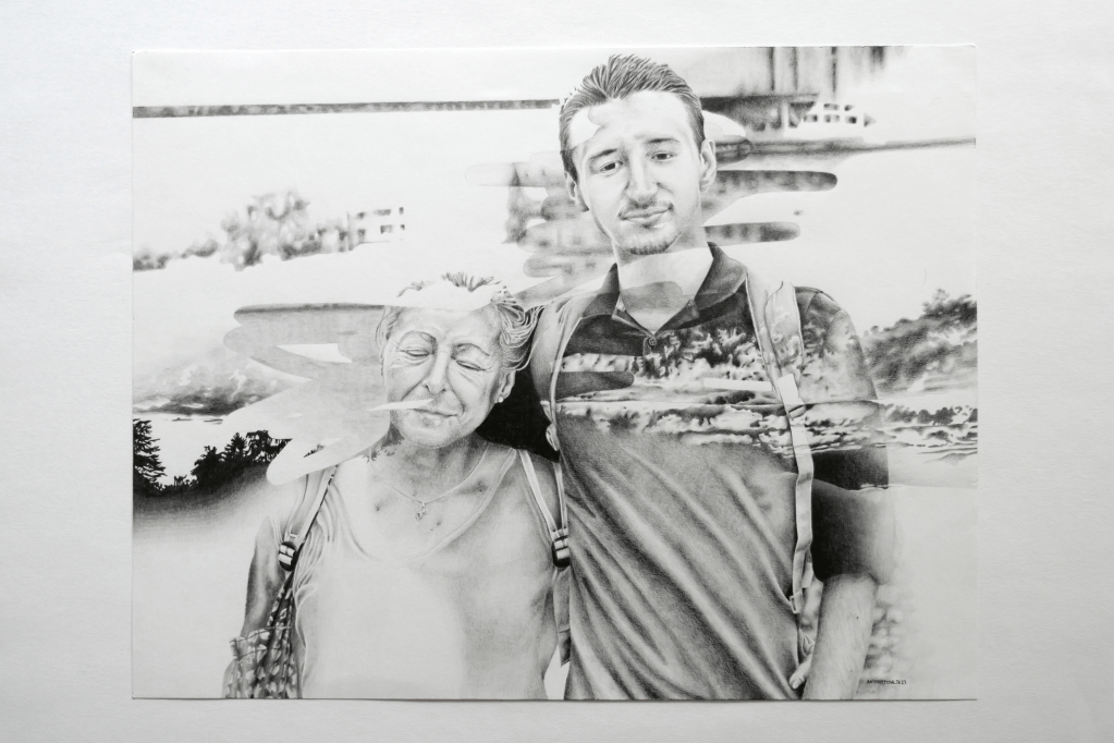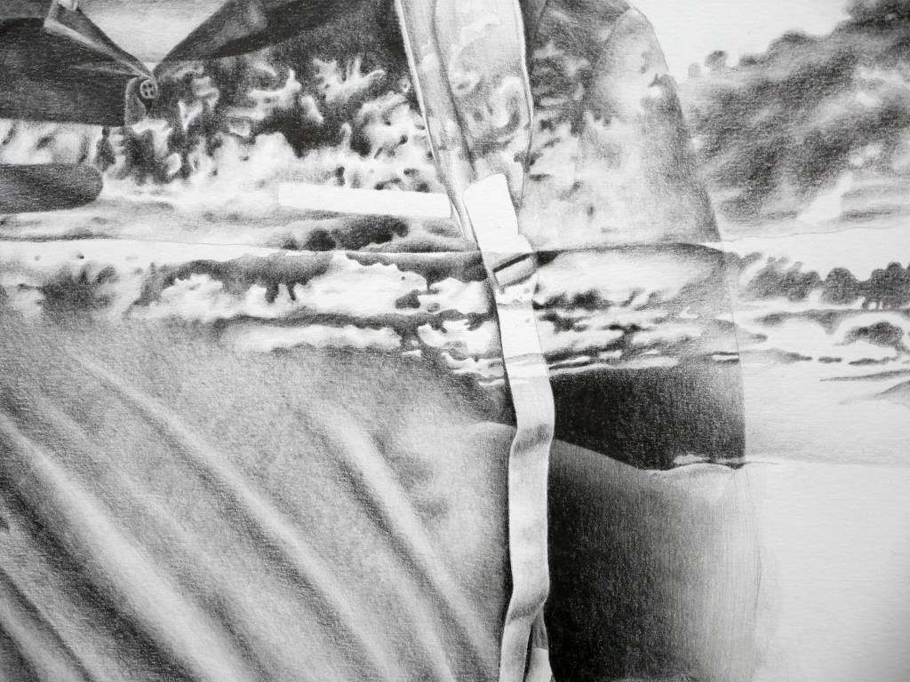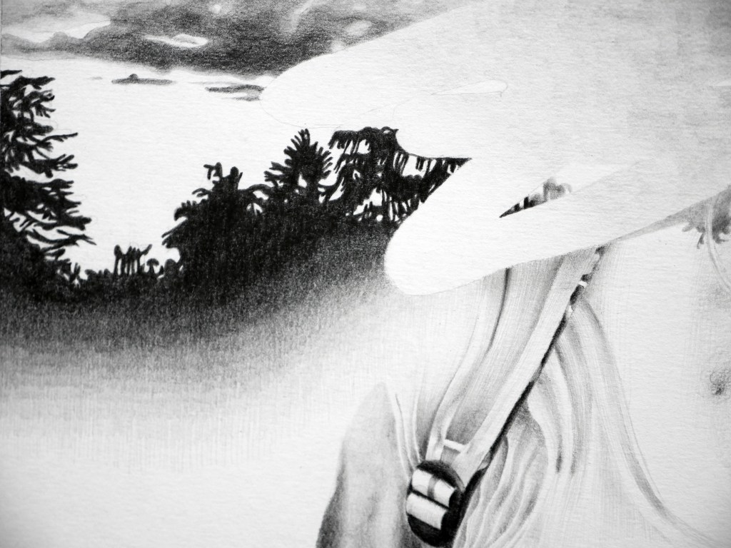 Je superpose des éléments, j’en soustrait, j’en rajoute. Les nuages d’un côté, la forêt de l’autre. Pas de ligne d’horizon, c’est mon frère qui crée une stabilité.